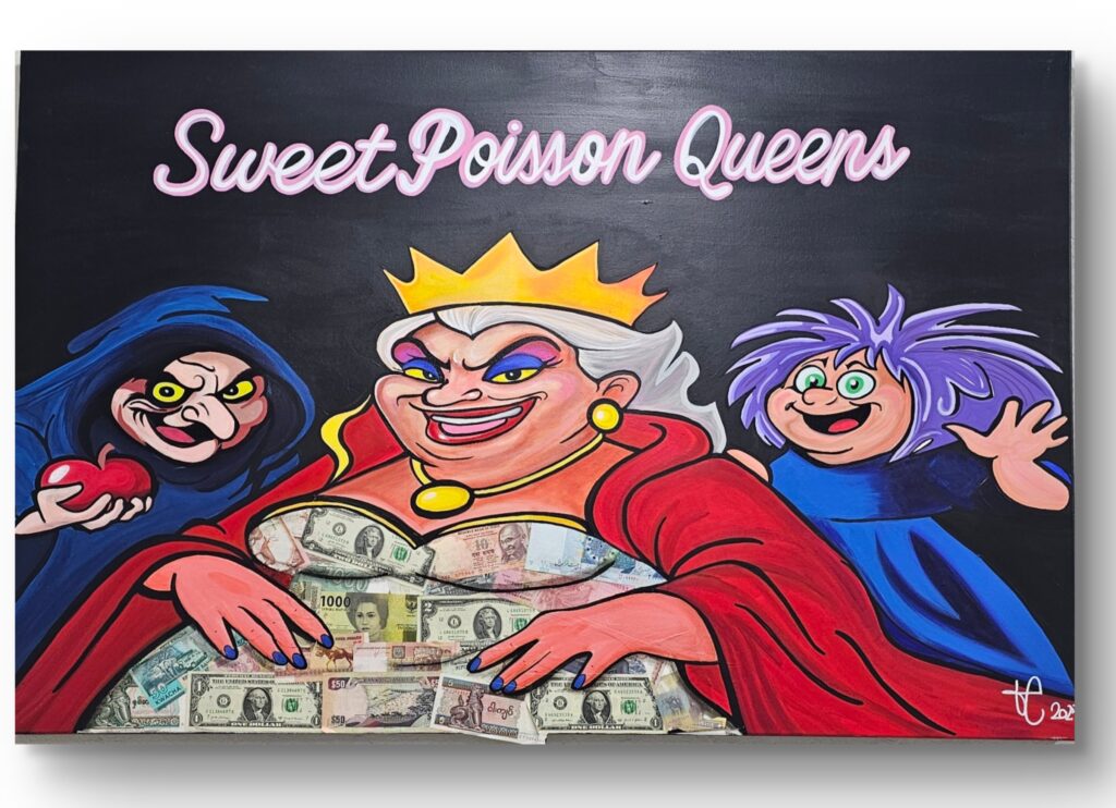 POP ART THIS IS ME (160 x 120 x 3 cm, 2023) $$$ (120 x 100 x 3 cm, 2023, SOLD) EL PATRÓN DE ROSA ( 100 x 80 x 3 cm, 2025) THE SOUND OF COLOUR ( 100 x 80 x 3 cm, 2025) SWEET POISSON QUEENS ( 80 x 120 x 3 cm, 2025)